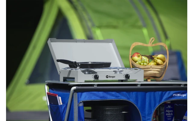 Durch eine spezielle Scharniertechnik ist die Abnahme des Deckels kinderleicht. Gumminoppen an der Unterseite verleihen dem Gaskocher mehr Standsicherheit. Gehäuse und Deckel aus pulverbeschichtetem Stahl. Robuster, verchromter sowie abnehmbarer Topfrost für sicheres Kochen und einfache Handhabung.