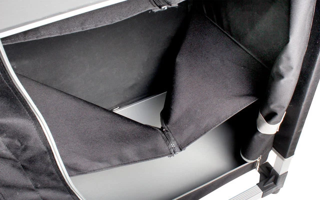 Großer Camping-Multifunktionsschrank mit 2 getrennten RV-Fächern und 6 innenliegenden Ablagen. Das schmälere Fach kann zudem dank mittig teilbarer Ablagen und einer eingebauten Hängestange zum Kleiderschrank umgebaut werden. Sehr stabile Ausführung mit Alu-Kreuzgestell und verwindungssteifen Rechteckprofilen. Vorder- und Hinterwand können durch eine spezielle Spannvorrichtung zusätzlich stabilisiert werden. Breite, schwenkbare Fußplatten verhindern das Einsinken des Schranks auf weichen Böden oder verhindern Beschädigungen am Zeltboden oder -teppich. Ein höhenverstellbarer Fuß erlaubt einen perfekten Niveauausgleich bei Bodenunebenheiten. Ein Gazefenster in der Rückwand sorgt für die Innenbelüftung des Schrankes. Mit praktischer Transport- und Aufbewahrtungstasche.