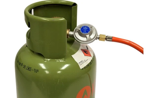 Regler und Schlauchset mit 1/4″ BSP-Linksaußengewinde. Geeignet für Niederdruck Grillgeräte und Gaskocher zum Anschluss an die Gasflasche.