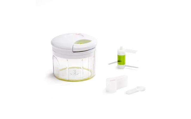 Mit dem Turboline Kräuter- und Gemüseschneider können Sie fast alle Arten von Zutaten schnell und effizient zerkleinern, indem Sie einfach am Griff ziehen! Das patentierte System ist mit schwenkbaren